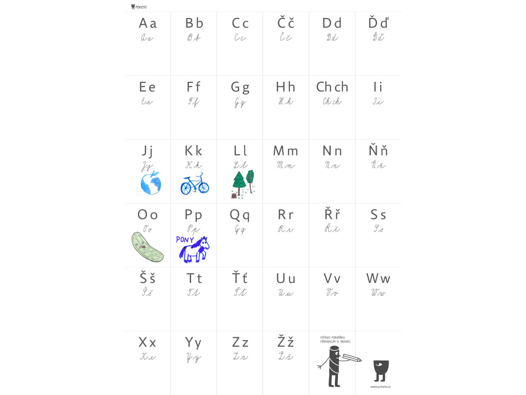Plakát dokresli si abecedu je vhodný pro děti, které rády tvoří. Sami nebo společně si můžete vytvořit originální plakát. Ke každému písmenku vymyslete jeden nebo více symbolů podle libosti. Dítě musí samo přemýšlet a najít vhodný obrázek k danému písmenku, lépe si tak jeho podobu zafixuje.